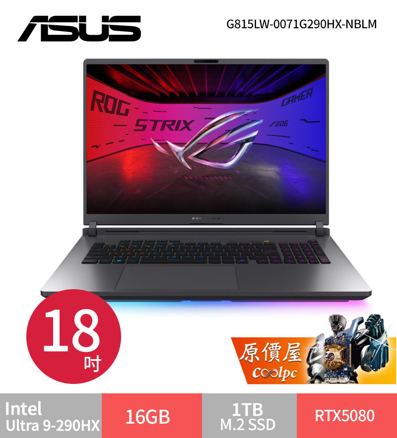 華碩 ROG Ultra 9-290HX/RTX5080/16G/1T/18吋 電光綠 G815LW-0071G290HX-NBLM $119999>蝦皮商城>官網