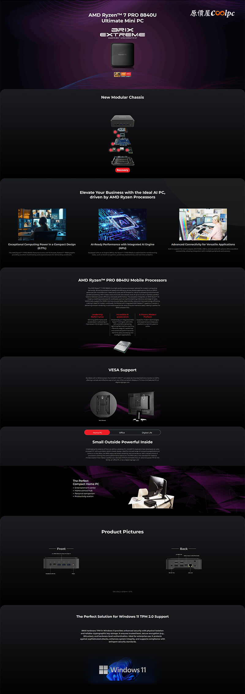 技嘉這台 BRIX GB-BER7 8840U 小主機以小巧的體積,完美詮釋卓越高效能!強悍的迷你電腦搭載 AMD Ryzen 7 PRO 8840U 處理器,具備 8 核心 16 執行緒,並內建最強的 Radeon 780M 內顯示晶片,即使應付 1080p 低畫質設定的 3A 遊戲也游刃有餘。處理器更內建專屬 AI 引擎 (NPU),能輕鬆執行 Windows 11 系統中的視訊去背與語音辨識等 AI 功能。擴充性方面同樣出色,機身 I/O 支援高達 4 組 4K 獨立顯示輸出(2 x HDMI、mini DP、USB4 Type-C),無論是多工處理、金融看盤或數位看板皆能輕鬆勝任,還配備 Wi-Fi 6E、2.5G 乙太網路與多達 7 組 USB 連接埠,應付工作與日常應用綽綽有餘。針對商務主機內建符合 Windows 11 企業安全標準的 TPM 2.0 晶片以保障資安;透過隨附的 VESA 支架,還能將其輕鬆隱藏於螢幕後方,秒變 AIO 電腦!搭配 32GB 記憶體與 2TB 容量硬碟配置,以及正版的 Windows 11 Pro 作業系統,完美跨足家庭、辦公與商業領域,開機設定好就能直接使用。