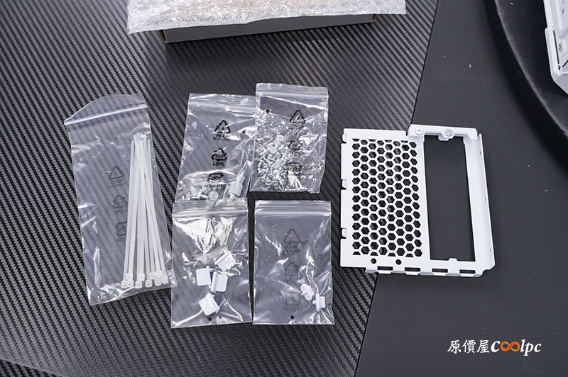配件和裡面除了固定螺絲之外,還有數條束線帶、防塵塞、顯卡垂直支架(需另購 PCIe 線材)。