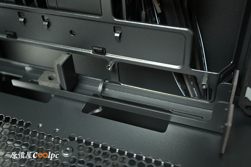 卸下後面側板後,背板的內部結構。也預留大面積的走線槽,背插或傳統線材都能保持整潔。
