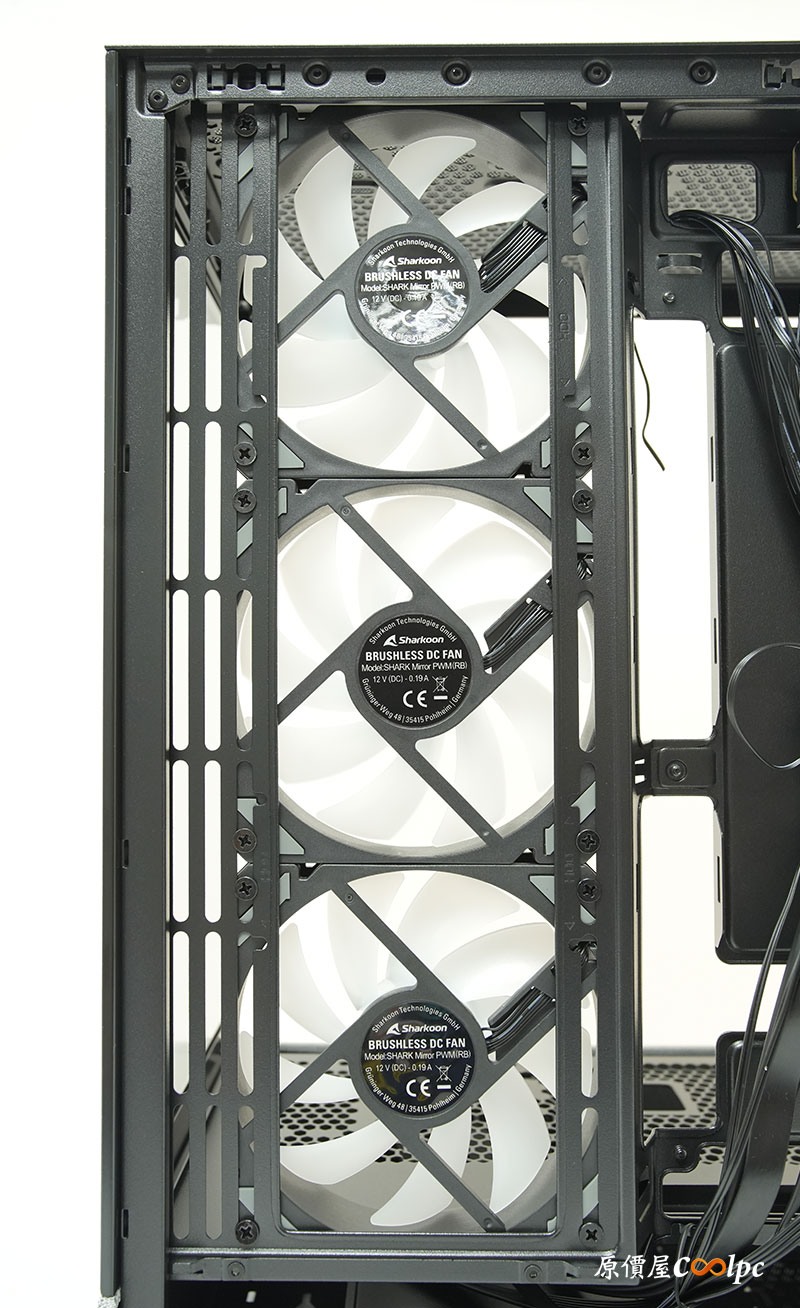 側邊的 3 顆風扇位置,也能自行換裝水冷排的設備。讓你能做雙水冷排搭配,一個 360mm+一個 280mm 的水冷排同時運作。