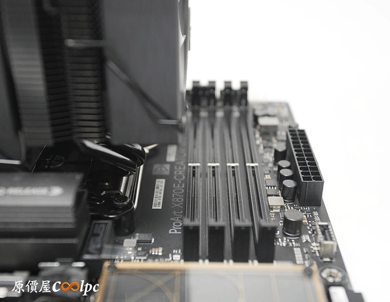 裝上主機板後,可以明顯看到偏移設計大成功,散熱器完美避開RAM插槽,如果RAM有RGB燈光也完全不會遮擋喔。