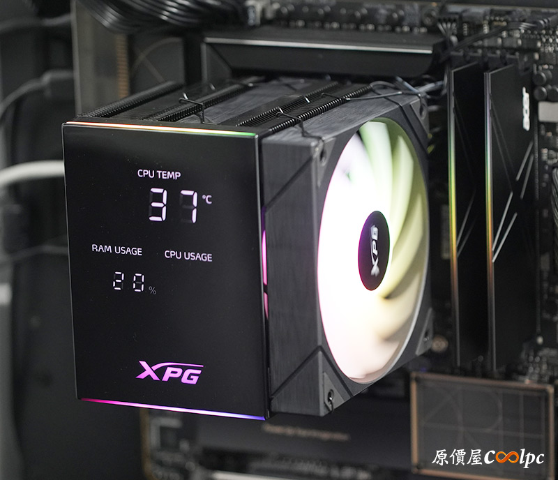開機後要先到官網下載XPG PRIME軟體並開啟,否則散熱器上的數位面板不會有畫面喔。顯示的內容有CPU溫度、CPU使用率、RAM使用率,平時透過機殼玻璃側板就能直接看到運作狀況,並且面板上下兩側、XPG字樣、風扇都有ARGB燈效,透過主機板軟體就能和其他裝置同步。