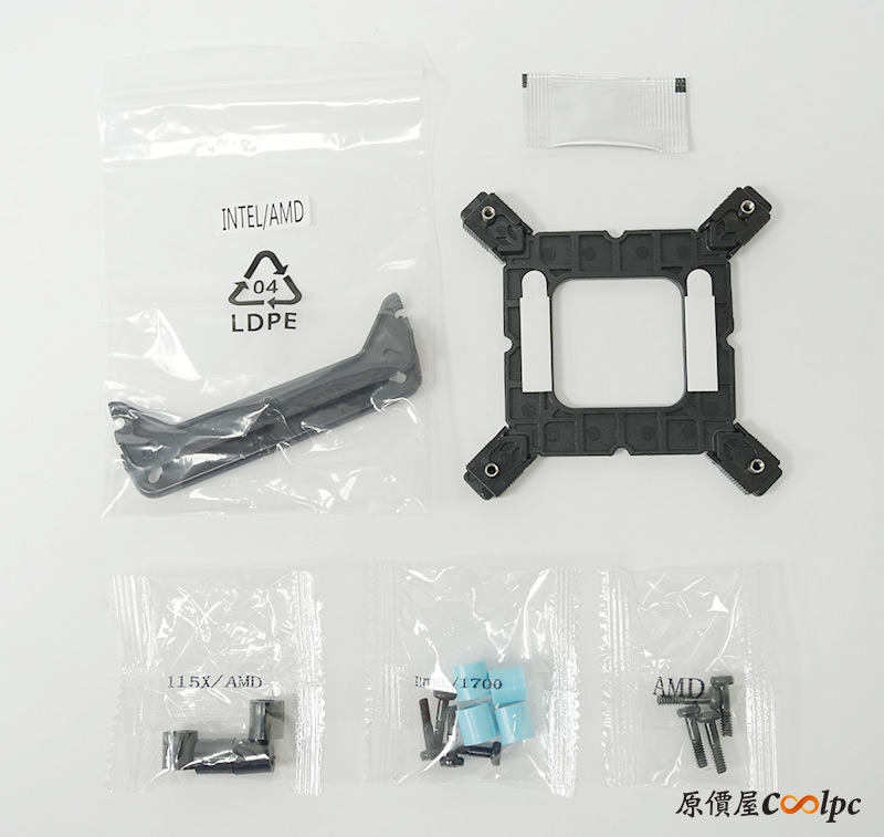 內容物其實大同小異,有Intel與AMD共用的散熱器底座,支撐底座的圓柱及螺絲則是根據安裝腳位分裝,還有Intel平台專用的強化背板,以及一小包散熱膏。