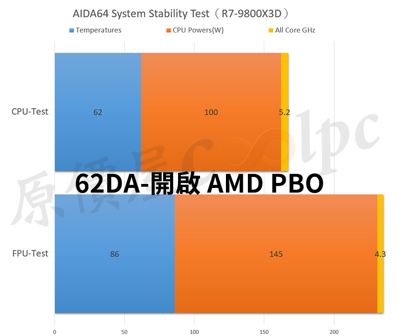 最後針對XPG MAESTRO PLUS 62DA進行滿載燒機測試,測試平台採用 AMD Ryzen 7 9800X3D 處理器,溫度測試使用 AIDA64 System Stability 進行 CPU/FPU 壓力測試。