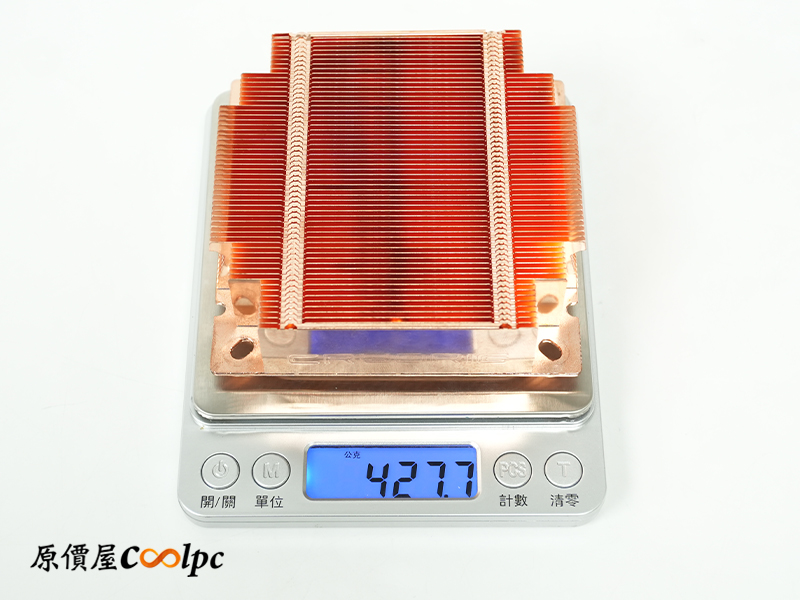 既然是純銅製造,那肯定是相當有份量!光是散熱器本體淨重就有400多克,再加上風扇更是突破500克!