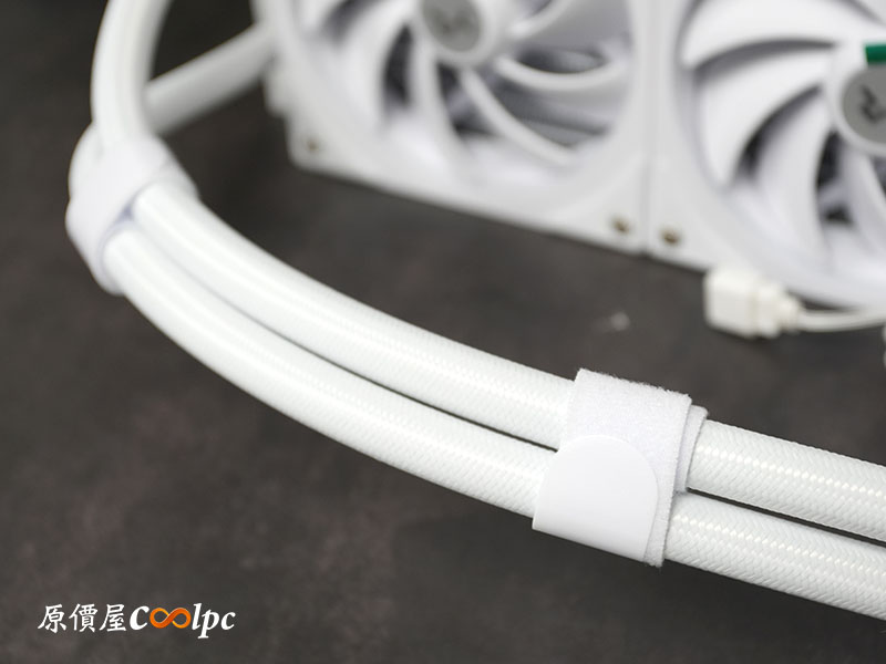 (點小圖放大)DeepCool LM360 WH 水冷散熱器顧名思義是 360mm 尺寸設計,冷排加入獨特動態平衡卸壓技術,降低漏液風險並延長壽命!預先安裝 3 顆 120mm 幻彩星環風扇(FL12 SE),質感除了全白設計之外,還有 ARGB 透光風扇 + 風扇中間的導光片,讓幻彩燈光魅力四射!此外風扇四邊角皆有防震軟墊,降低共振噪音。連接方式採用 8Pin 母孔整合 PWM 及 ARGB 訊號,DIY 更簡單!水冷管使用白色編織包覆,再加入兩條魔鬼氈束線,既美觀又耐用!