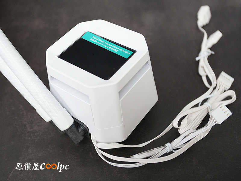 (點小圖放大)水冷頭中央加入 2.4 吋 IPS 顯示器,提供 320 x 240 解析度,透過 DeepCreative 軟體可自訂顯示內容(硬體資訊、JPEG/PNG圖片、MP4/GIF),同時在冷頭四周也加入 ARGB 燈光設計,屆時上機一定很讚!水泵連接線提供 4Pin PWM(PUMP) 電源 & 9Pin USB LCD 訊號線 & 3Pin ARGB 訊號線。