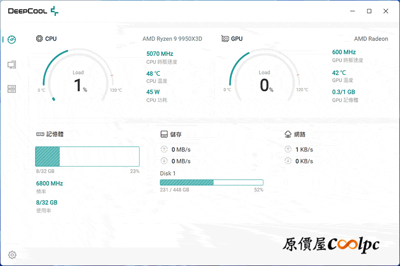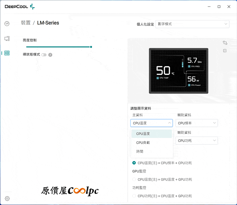 回到 DeepCreative 軟體我還是介紹一下,軟體可以偵測基本的硬體資訊內容、狀態、使用量,最重要的是設定 DeepCool LM360 WH 水冷 2.4 吋 IPS 面板內容。