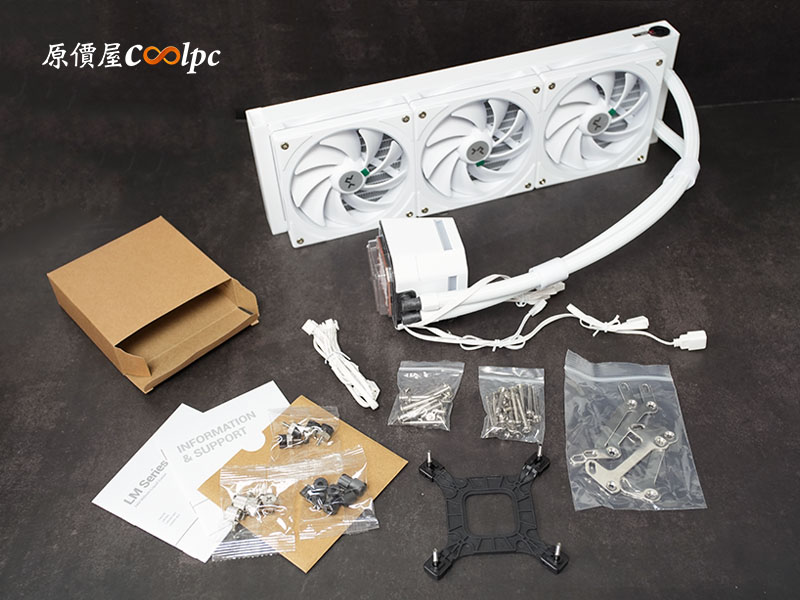 內容物共有 DeepCool LM360 WH(白) 水冷散熱器、螺絲包、Intel 強化背板、AMD + Intel 扣具、快速入門指南、4Pin PWM + 3Pin ARGB to 3 * 8Pin分接線。冷頭底部已預塗導熱膏,確保最佳熱傳導。