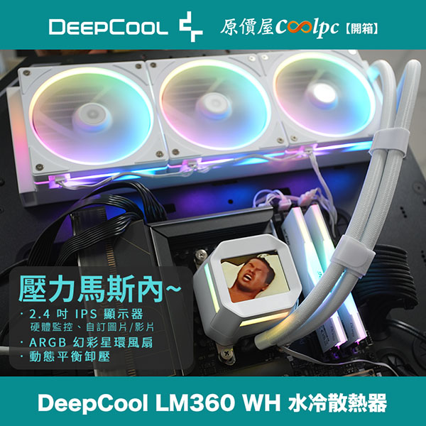 @2025/10/03 ,11:42剛剛裝水冷的時候你偷看了對吧?水冷發展從無光到白光,再來有 ARGB 幻彩燈光,現在又有 LCD 顯示器…花樣越來越多!九州風神在所有元素具備的情況下,還能做出 C/P 價值!這回原價屋帶來 DeepCool LM360 WH 一體式水冷散熱器,2.4 吋 IPS 顯示器冷頭搶盡鋒頭,支援硬體監控與自訂 JPEG/PNG 圖片或 GIF/MP4 影片!搭配預裝幻彩星環三風扇,一條線便可串接完成,且燈光支援各大廠燈光同步軟體,DIY 組裝方便又整潔!更特別的是獨特的動態平衡卸壓(Anti-Leak)技術,內部壓力透過閥門控制,有效降低漏液風險並延長壽命。可支援主流 Intel LGA 1851/1700/1200/1151/1150/1155 及 AMD AM5/AM4 平台,水冷本體 5 年保固,LCD 螢幕 3 年保固,DeepCool LM360 黑/白雙色兩款都賣 NT$3690,在 DIY 市場算滿有競爭力了。有興趣的朋友可往下參考 DeepCool LM360 WH(白) 水冷散熱器的開箱。