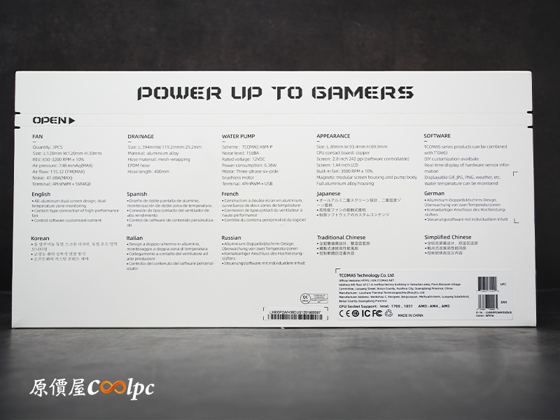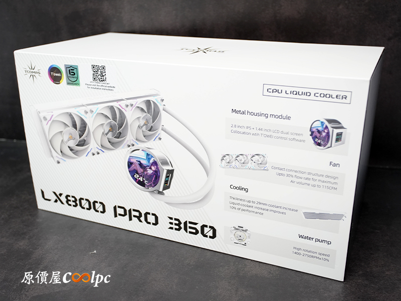(點圖放大)不得不說,這款 LX800 Pro 360 水冷拿起來還真有點份量!實際秤重大約 2.6 公斤,光重量就能感受到它的扎實感。包裝外盒採用白色基底搭配彩色本體印刷(黑色款是黑底),側邊清楚標示了幾項重點特色:包含 2.8 吋 IPS + 1.44 吋雙螢幕設計、三顆高轉速 30mm 厚風扇、加厚至 29mm 的冷排、最高轉速 2750rpm 的水泵,以及六年漏液保固。背面則以多國語言呈現產品特色,設計上走的是簡潔卻不失專業的路線。