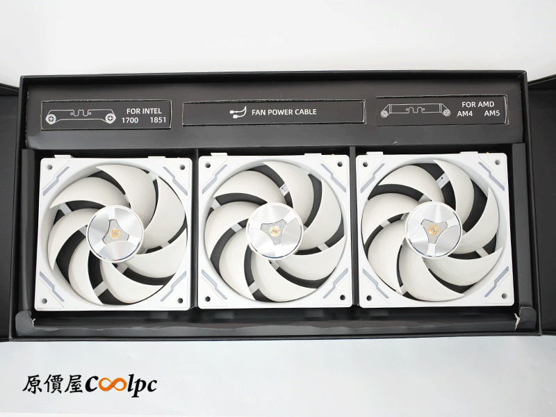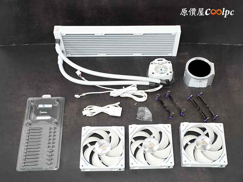 包裝細節太多,把東西攤出來看,內容物包含水冷本體、磁吸螢幕、積木扇*3、風扇專用連結線、 INTEL 和 AMD 專用水冷頭扣具、以及螺絲配件包。