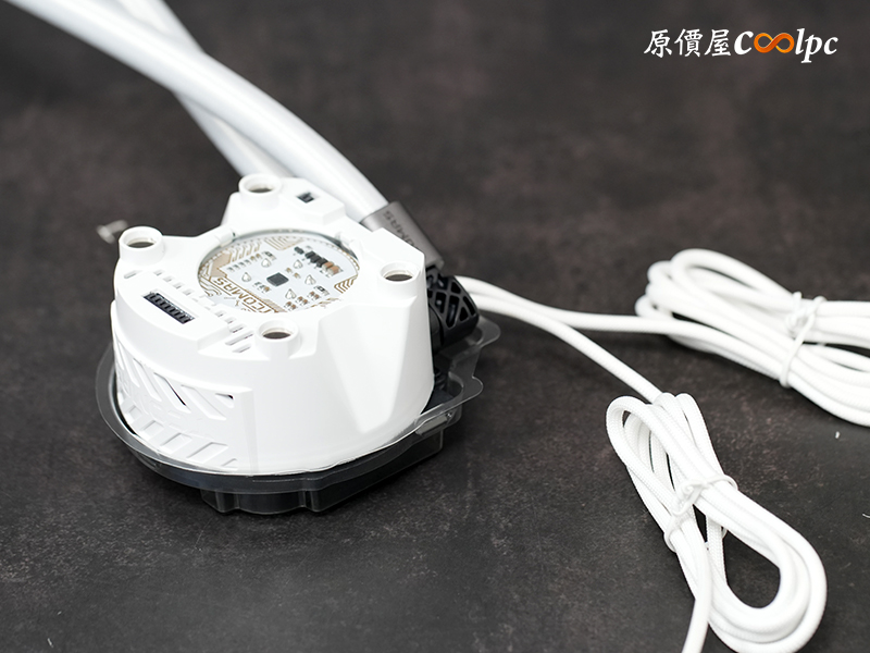 (點圖放大)冷頭頂部設計了一塊透明窗口,可以清楚看到內部電路板元件,科技感十足。水管兩端則加裝了金屬飾環加固,看起來又結實又有質感。水泵的 4Pin PWM (PUMP) 電源線 和 9Pin USB (母) 線 都採用編織網包覆,耐用也好看。冷頭最高轉速為 2750 rpm ±10%,性能穩定又安心。