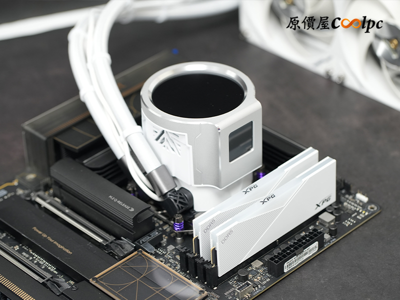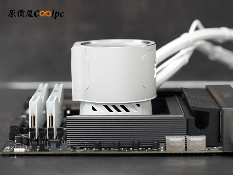 實際安裝後會發現,冷頭所需的安裝範圍意外地小!小編這張主機板本身的散熱鎧甲體積也不算小,但從側面看依舊留有充足的空間,包括後方 I/O 遮罩、上方散熱片、以及下方 M.2 散熱片,相容性表現相當不錯。
