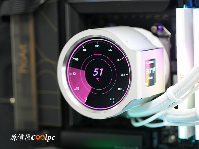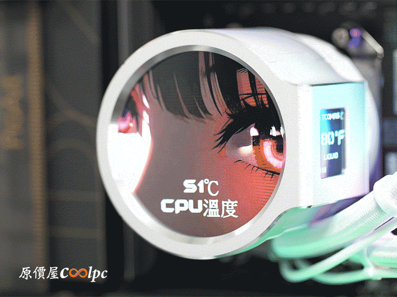再次提各位朋友,側面這顆 1.44 吋小螢幕主要用來顯示水冷液溫度的,CPU 溫度之類的系統資訊是看正面大螢幕唷!