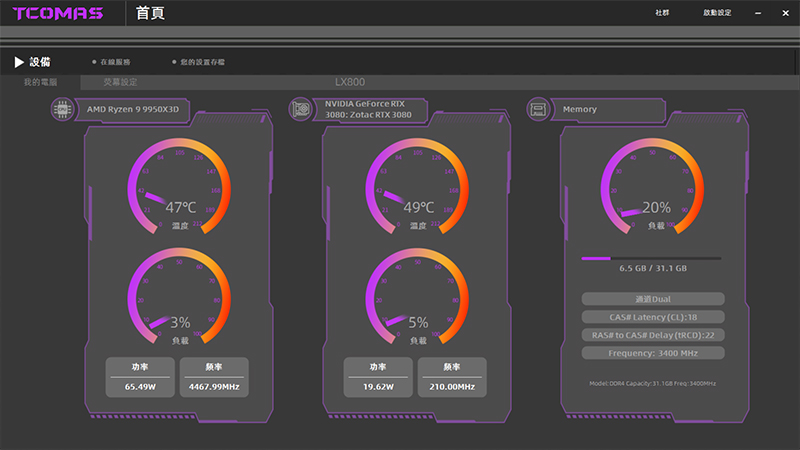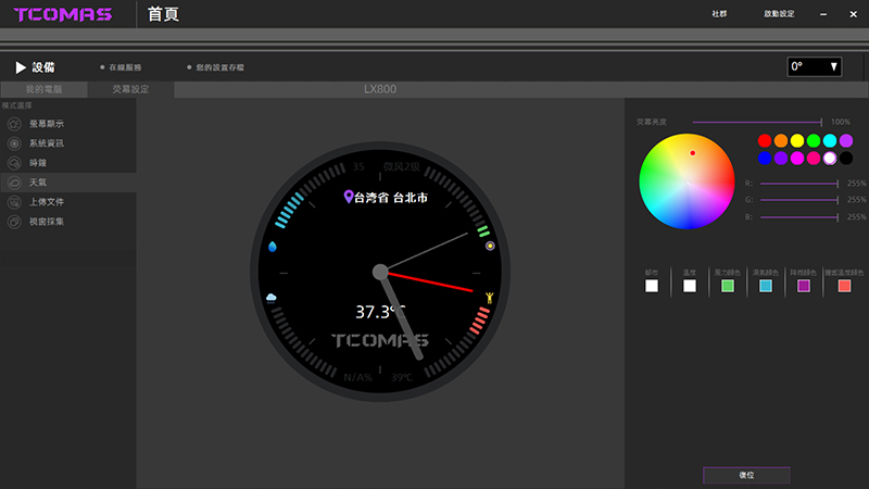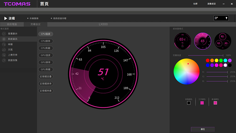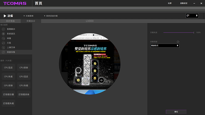 安裝好水冷後記得到 TCOMAS 官網下載專用軟體 (點我前往),軟體首頁會顯示目前CPU、顯示卡及記憶體使用狀態,更進階的的設定要在左上角的螢幕設定進行。