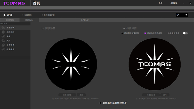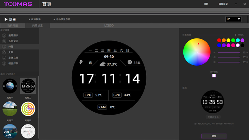 螢幕首頁可以設定成開機動畫或待機的靜態畫面,還能支援上傳圖片。你還可以選擇要不要顯示溫度,想低調一點甚至整個螢幕關掉都行。