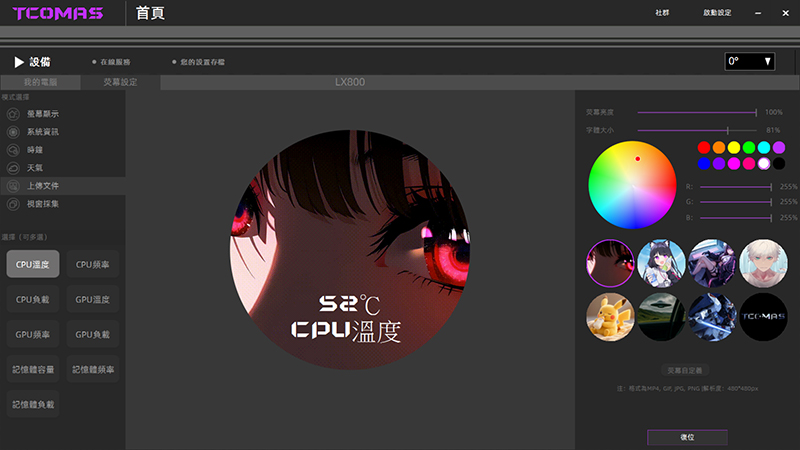 上傳文件可以讓你自訂顯示內容,例如圖片或影片,支援 MP4、GIF、PNG、JPG 等格式,左邊還能勾選要不要在畫面上加上系統資訊,如果一次勾了好幾項,螢幕就會用輪播的方式依序顯示。想調整位置也很直覺,用滑鼠拖曳文字就能改到你想要的地方就好。