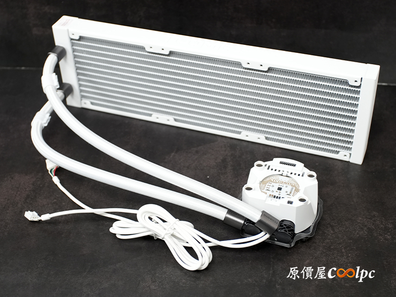 水冷本體細節非常多,據官方介紹冷排為鋁合金材質,厚度有略為加厚至 29mm,比常規的 27mm 冷排提升15% 散熱效率。