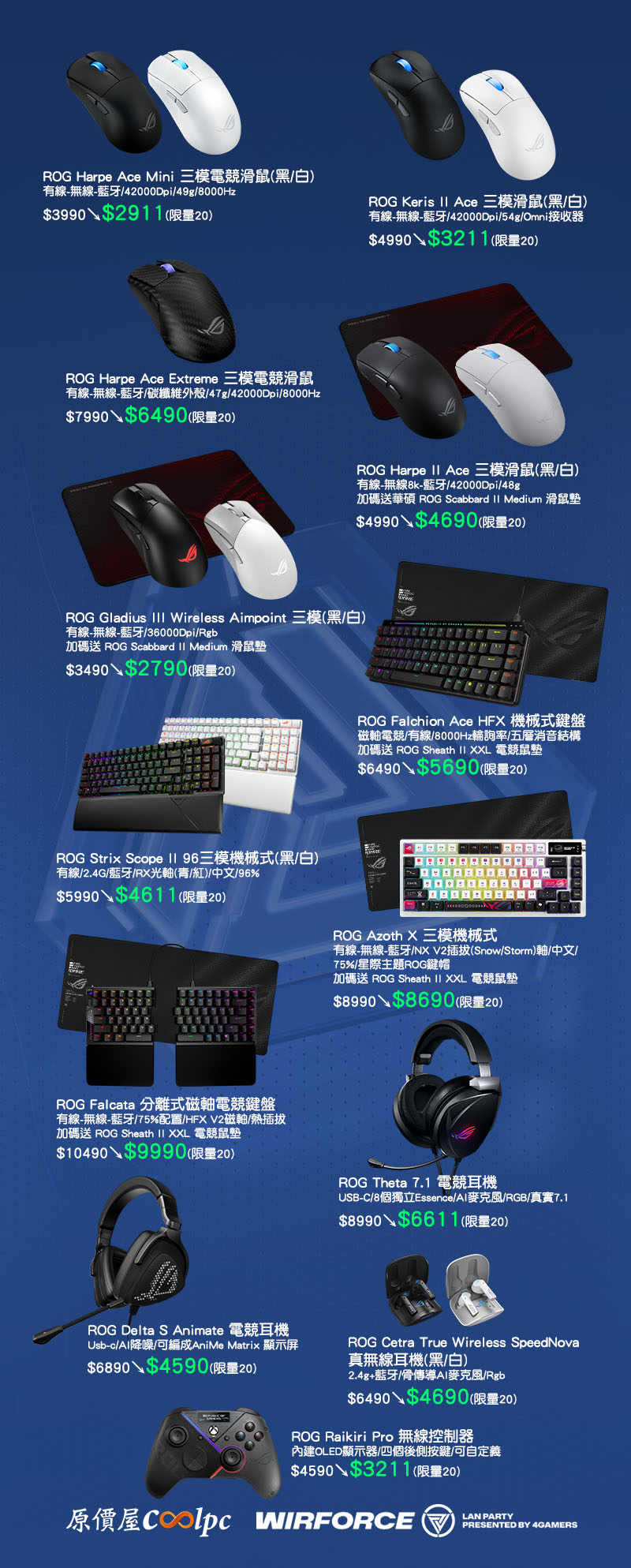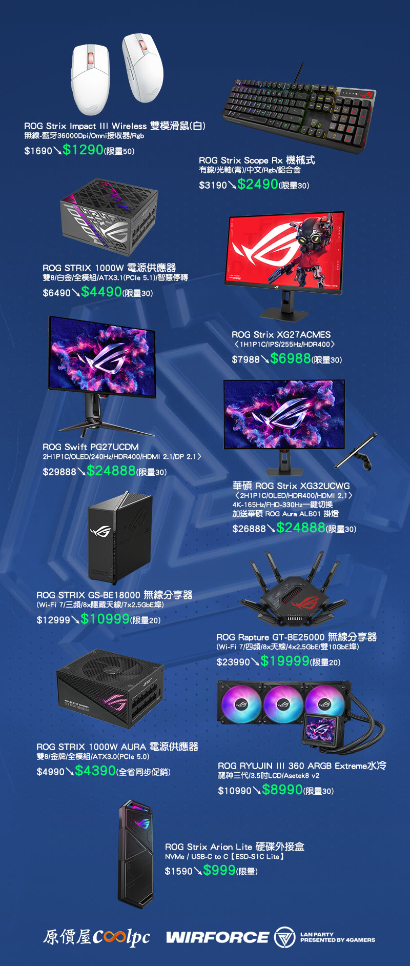 會場限定!免費入場!2025 WirForce x 原價屋聯手打造電競饗宴,我們準備了琳瑯滿目的華碩 ROG 系列商品!特別是 ROG Strix XG32UCWG OLED 高階電競螢幕直降 NT$2,000 再送價值 NT$4,688 的 ROG Aura ALB01掛燈;ROG STRIX 1000W 白金電源現折 NT$2,000;ROG Strix Scope Rx 機械式鍵盤也只要 NT$2,490,共通點就是價格很殺很限量