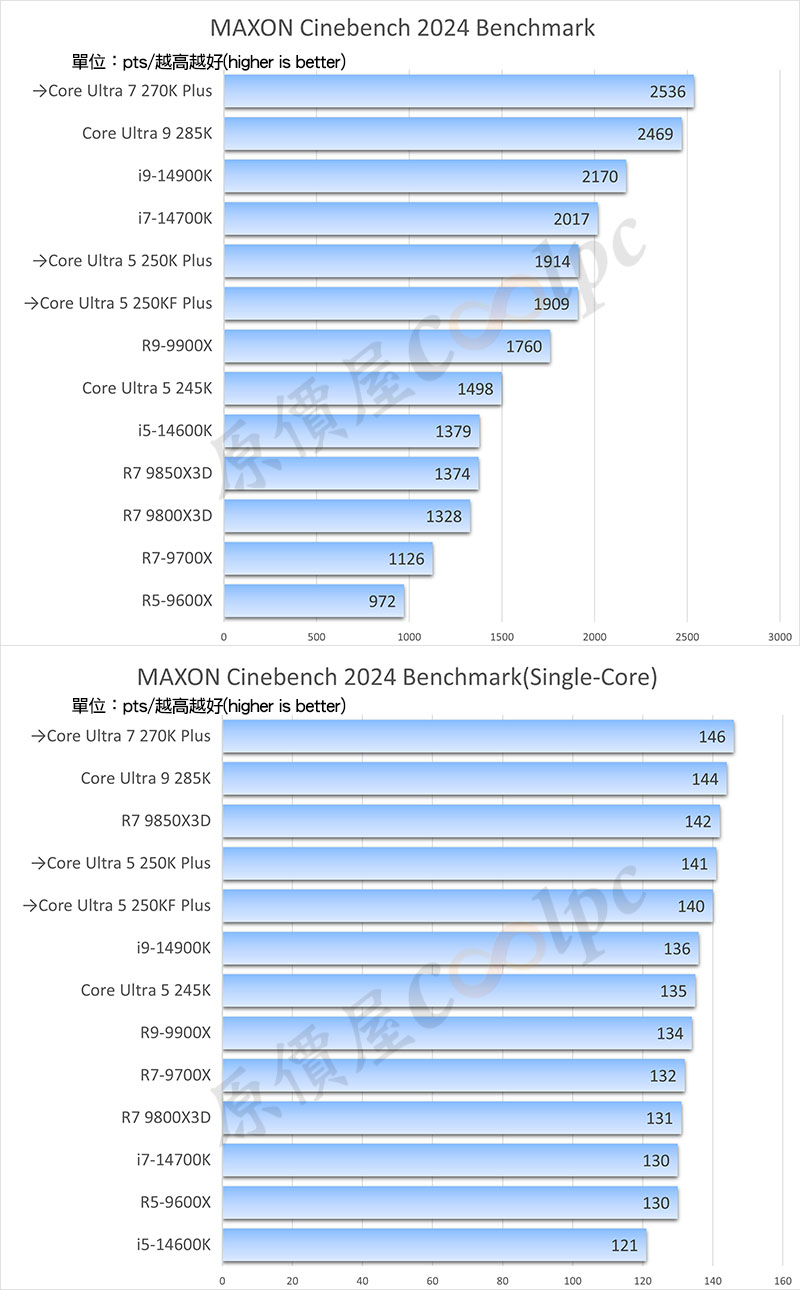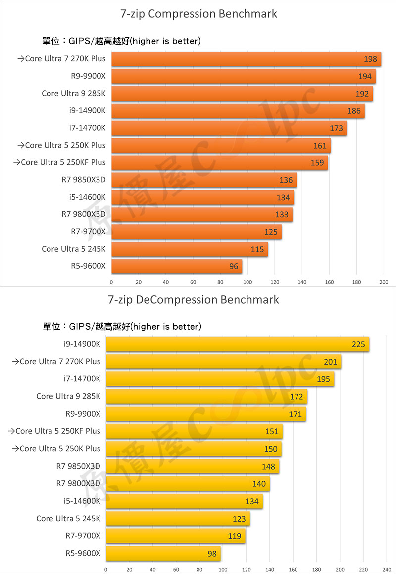 Core Ultra 7 270K Plus (24核心/8P+16E):P-core 3.7G (↑5.5G)、E-core 3.2G (↑4.7G)