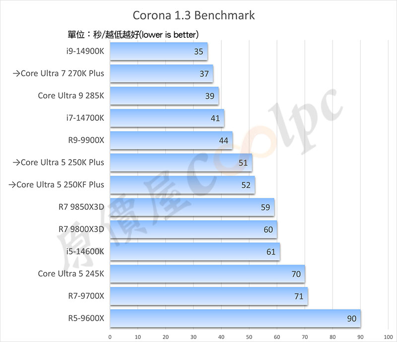 Corona 1.3 軟體主要針對 CPU 渲染性能做測試,數字越低表示速度越快。
