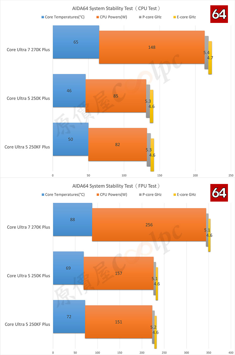 Intel Core Ultra 200S Plus 溫度及功耗燒機測試: