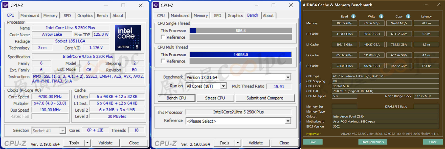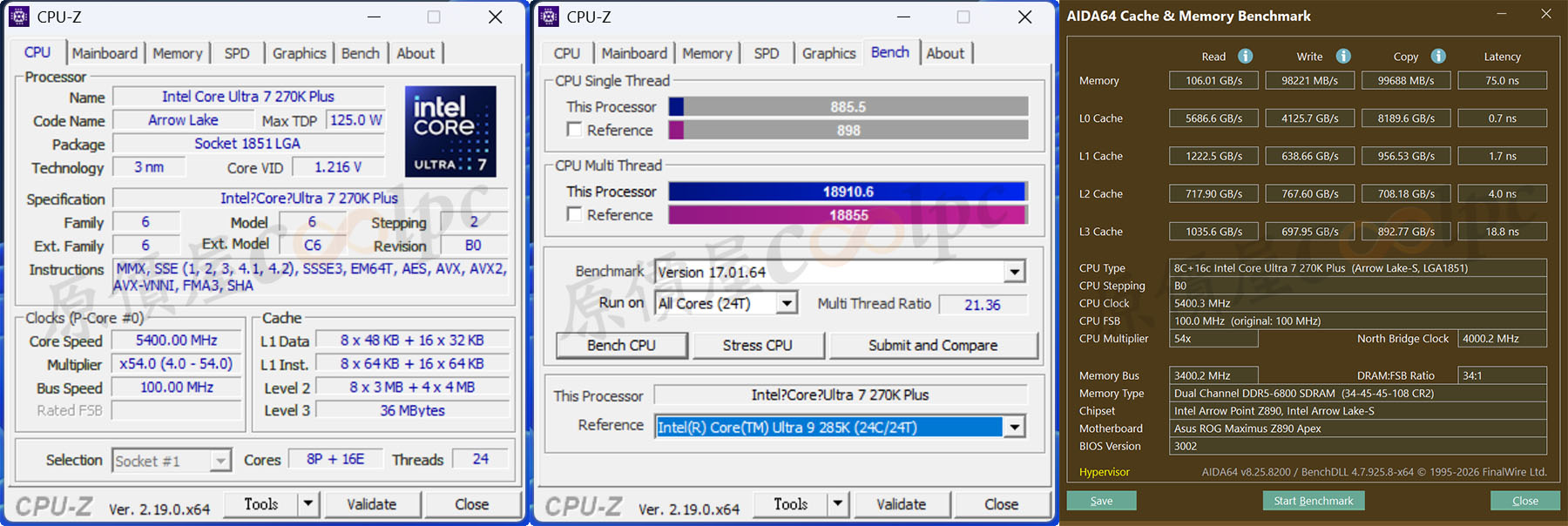(點圖放大)CPU-Z 資訊及 AIDA64 Cache & Memory Benchmark 測試結果。
