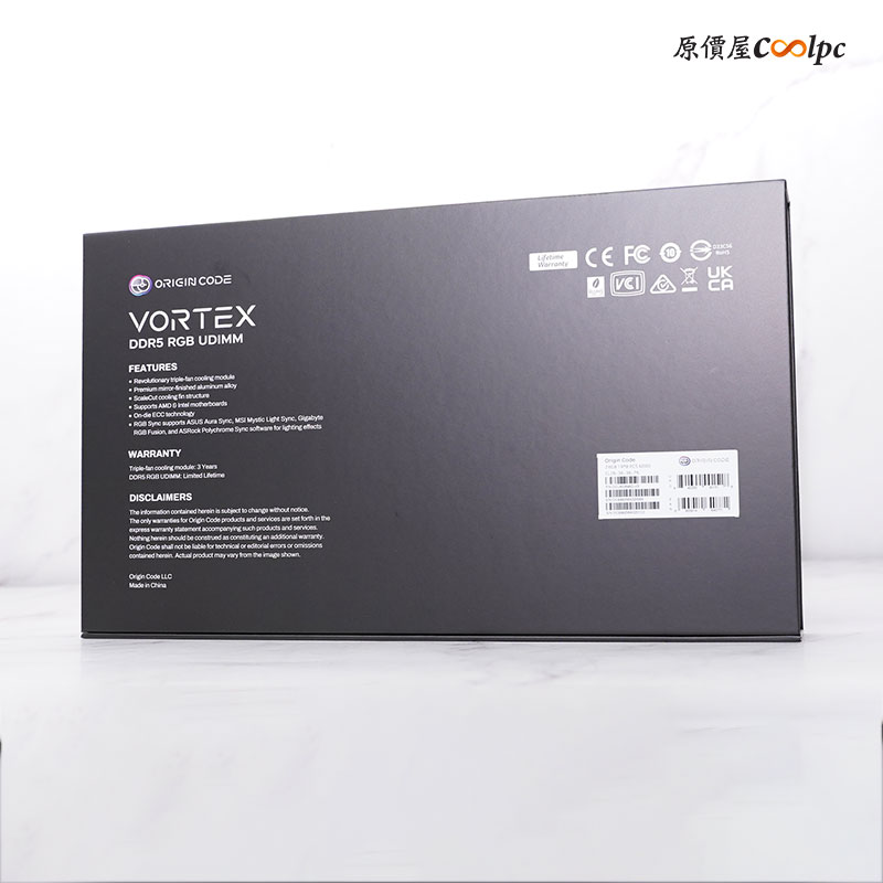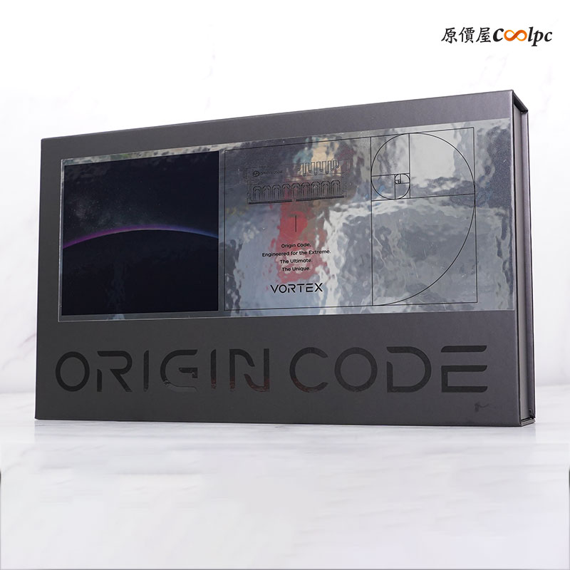 外盒包裝非常華麗,底下可以看到 Origin Code(原始碼) LOGO,正中間可以看到記憶體是 VORTEX 系列和記憶體外觀示意。