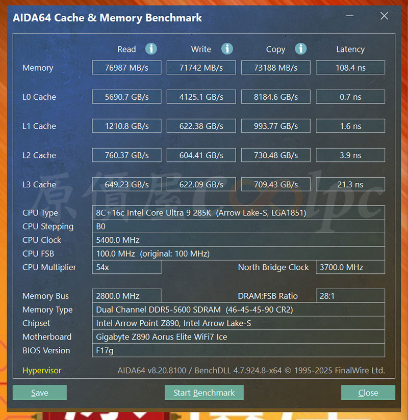 預設時脈是 5600MHz,透過 AIDA64 Cache & Memory Benchmark 效能測試 Read 76987 MB/s、Write 71742 MB/s、Copy 73188 MB/s、Latency 108.4 ns。