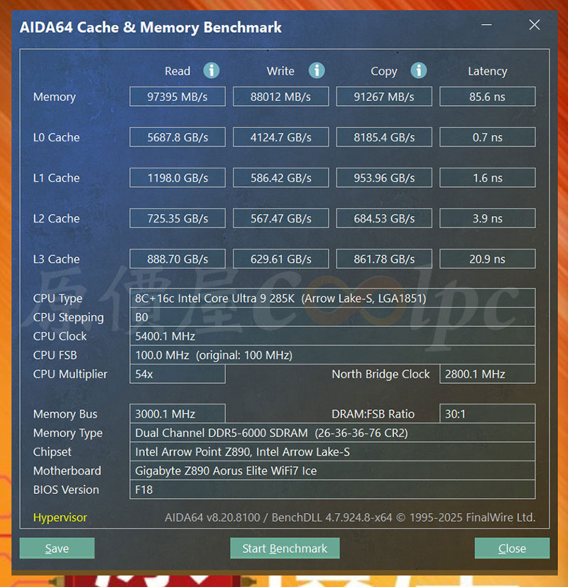EXPO 1 6000MHz 參數,AIDA64 Cache & Memory Benchmark 效能 Read 97395 MB/s、Write 88012 MB/s、Copy 91267 MB/s、Latency 85.6 ns。