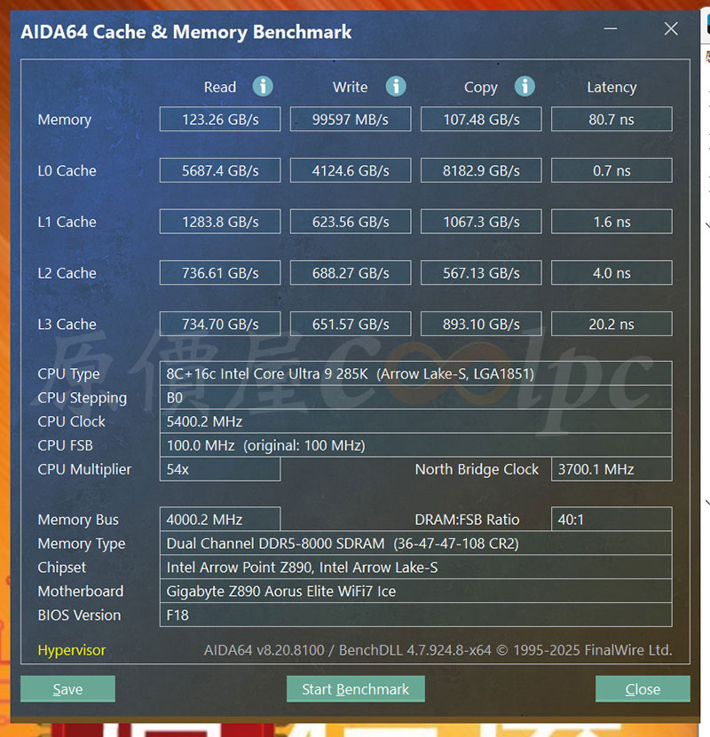 EXPO 2 8000MHz 參數,AIDA64 Cache & Memory Benchmark 效能 Read 123.26 GB/s、Write 99597 MB/s、Copy 107.48 GB/s、Latency 80.7 ns。