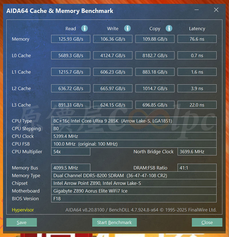 手動套用 8000MHz 參數上 8200MHz,AIDA64 Cache & Memory Benchmark 效能 Read 125.93 GB/s、Write 106.36 GB/s、Copy 109.88 GB/s、Latency 76.6 ns。