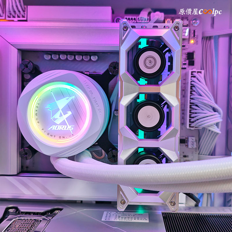 這種電鍍鏡面記憶體,肯定是要配全白色系的零件才好看!裝上風扇的樣子也很美!記憶體上的 RGB 燈光會微微地從風扇透出。