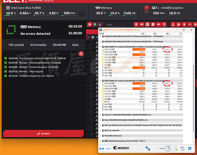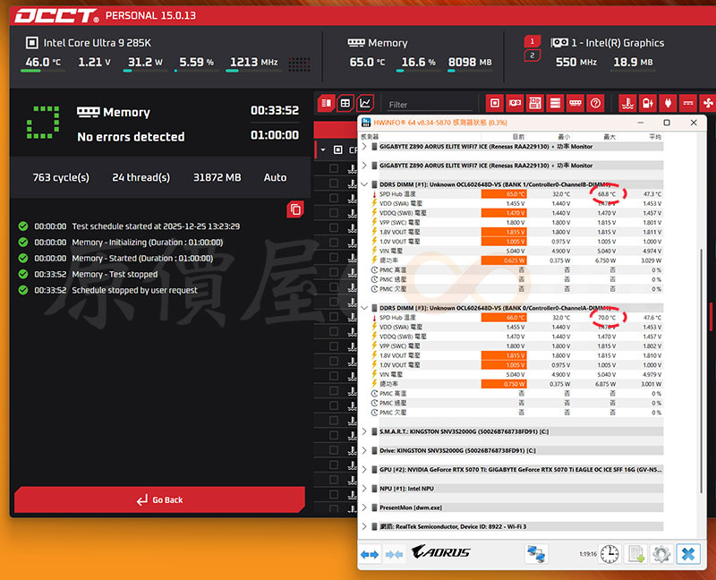 接著讓我們來看看三風扇散熱模組有沒有效,使用 OCCT Benchmark 記憶體 80% 負載測試不裝散熱器的部分,30分鐘測試下來,記憶體 SPD Hub 溫度最高來到 70 度,是不是沒想過記憶體溫度會這麼高。