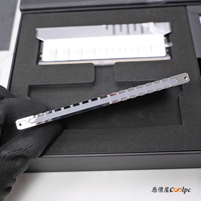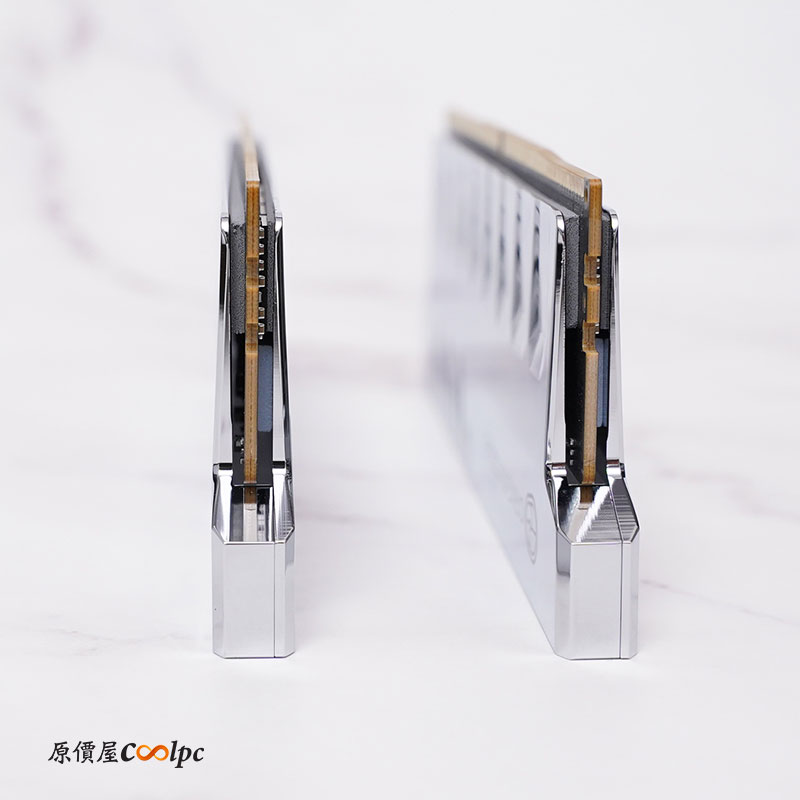 記憶體雙面採用鋁合金電鍍,呈現鏡面質感,出廠會有膠膜減少指紋和刮傷,外觀圖案為魚鱗倒扣造型設計,精密切削出 0.75mm 雙斜角凹槽,可大幅提升散熱面積,有效強化導熱效率。
