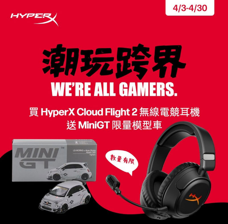 在找一副打遊戲穩、聽音準、還能順便收藏車的耳機嗎?這波 HyperX Cloud Flight 2 無線耳機優惠活動真的太正點!不只降價,還要直接送你一台車呢~等於耳機+收藏一次滿足!主打穩、久、舒服,是那種一戴上去就不想拿下來的類型。具備無線低延遲連線、長效續航、記憶耳罩設計,以及可拆式麥克風與 HyperX 經典調音。現在只要 $4290!再加碼送上 MiniGT 限量模型車,想要的玩家朋友盡快啊~