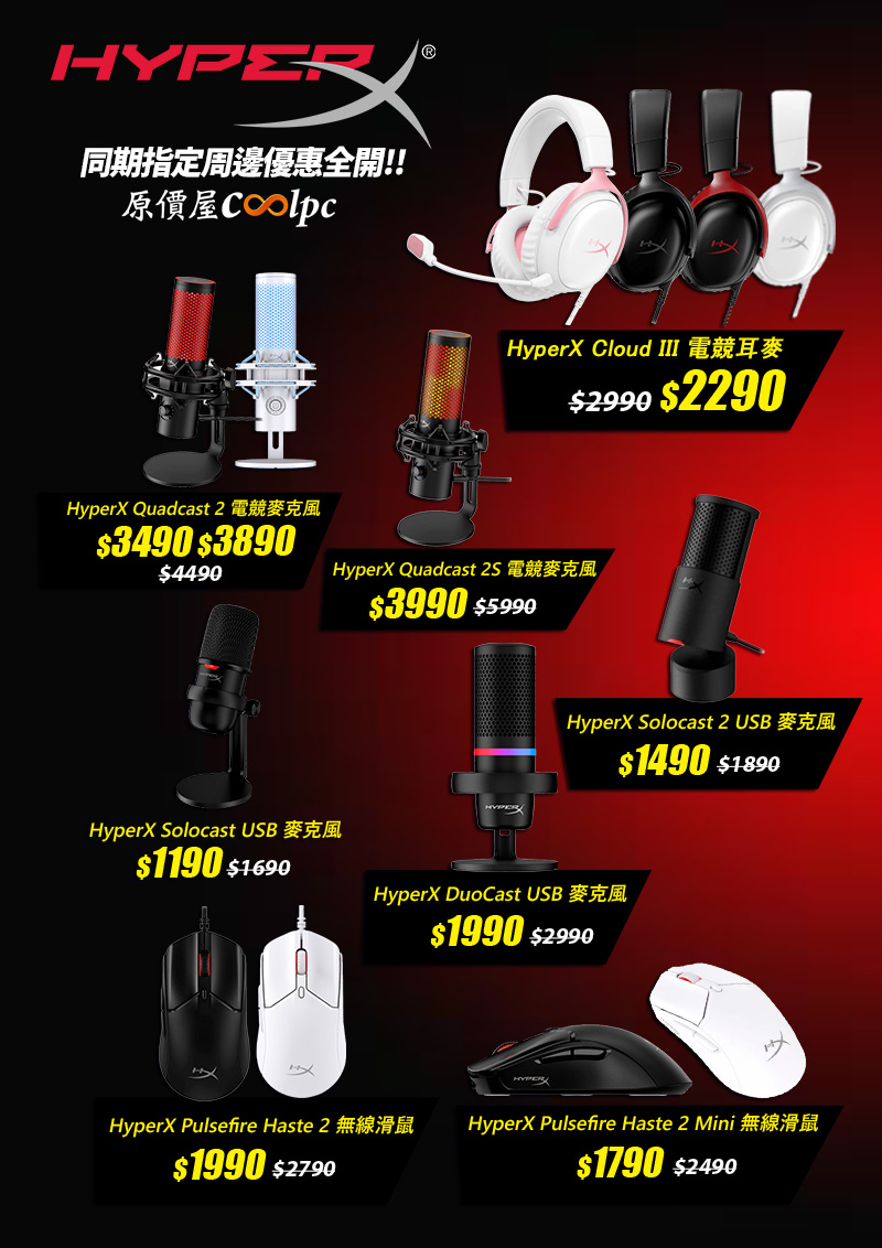 當然,這次的同期優惠也一樣兇!現在整套升級真的剛剛好~如果你打算直接來一套完整的遊戲設備,那這次同期優惠真的可以順便帶一波~先來看看入門高 CP 首選「Cloud III 系列耳機」,共有黑、黑紅、粉、白四款,原價 $2990,現在 $2290!如果你預算抓在 2K 左右,「Cloud III」幾乎是不用想就可以直接買的等級,舒適度跟音質都很穩,顏色選擇也多。再來,麥克風升級趁現在!「QuadCast 2 (黑)」優惠價 $3490!「QuadCast 2 (白)」優惠價 $3890!還有「QuadCast 2S」優惠價 $3990!,如果你的預算有限,也可以挑選「SoloCast」這款,因為它的價格也從原價 $1690 降至 $1190!另外也有「DuoCast」,優惠價也是不用兩千的 $1990!不管你是實況主、語音玩家還是開會需求,這波價格真的都很甜呢~另外,想要滑鼠的朋友也照過來!「Pulsefire Haste 2 (黑/白) 只要$1990!體積小而巧的「Haste 2 Mini (黑/白) 也有折扣 $2490 降到 $1790。是主打輕量+高靈敏度的設計,FPS 手感派玩家絕對愛!總結一句…. 這波不只是買耳機,是整套升級的起點呢!