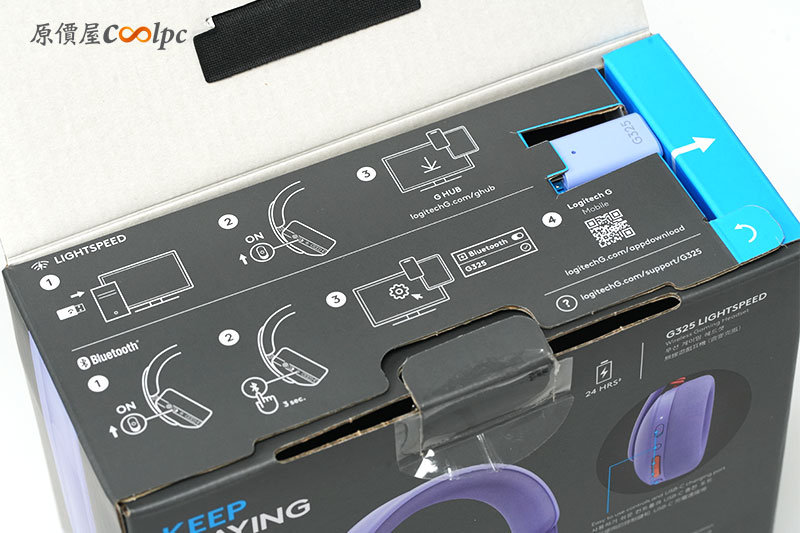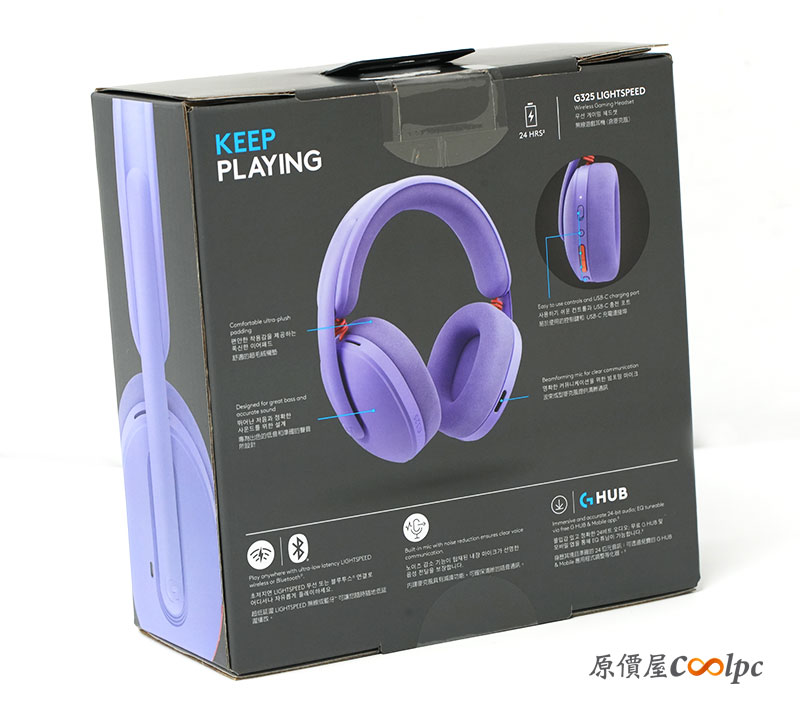外盒正面有經典羅技 G 系列的包裝設計,正面直接展示耳機本體與 LIGHTSPEED 字樣,丁香紫版本辨識度非常高,第一眼就有潮流電競感。背面也清楚標示產品特色,包含雙模連線、輕量設計與長效續航,基本重點一覽無遺。