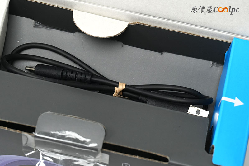 打開盒裝的方式由頂端開始,第一層印有簡易的圖文說明,一旁還有提供 2.4GHz 無線連接用的 USB 接收器。第二層則是擺放連接線材的位置。最往下一層,可以看到有放保護套裝著的耳機本體。