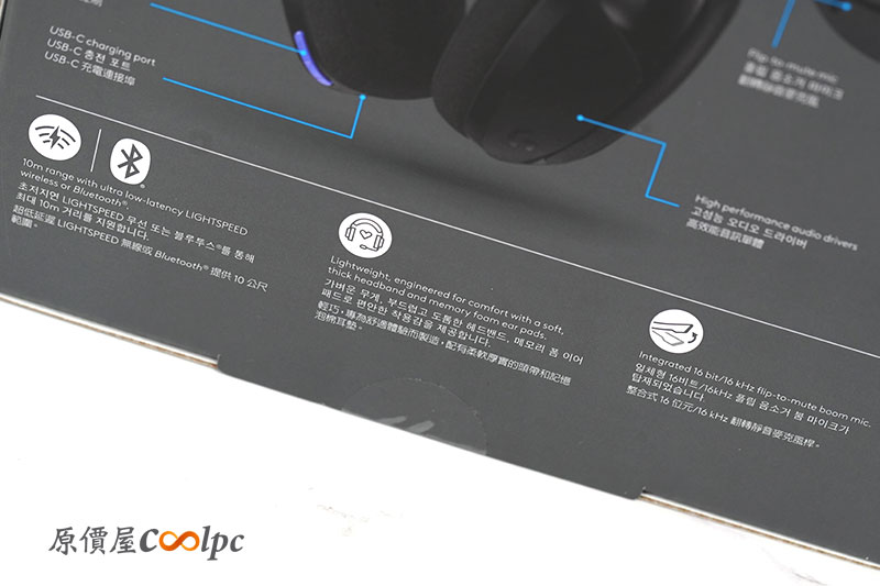 包裝背面則列出了產品的重點特色,包括雙模無線連線、翻轉式麥克風與長效續航等,讓玩家在開箱前就能快速掌握 G321 的核心重點。