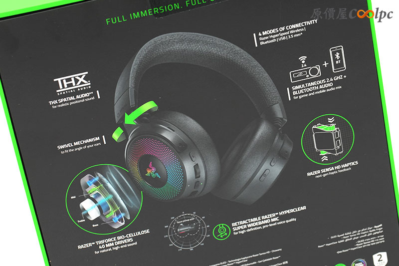 Razer Kraken V4 Pro 採用經典黑綠配色包裝,正面直接標示產品本體與旗艦級定位。包裝設計延續 Razer 一貫的電競美學,簡潔卻帶有科技感,也暗示這款耳機主打的不只是聲音,而是完整的沉浸體驗。