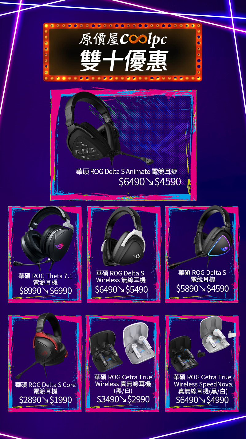 當然好料不只這一款,這次的下殺名單一整排讓人眼花撩亂!像是體驗真實 7.1 聲道、精準聽聲辨位 的,ROG Theta 直接讓你聽見敵人的呼吸聲,還有想解放桌面、享受無線自由的,Delta S Wireless 延遲超低、穩定度滿分!如果你追求音質細膩,那擁有 Hi-Fi 級音效的 Delta S 絕對是經典實惠之選,預算有限的玩家也別擔心~Delta S Core 免兩千就能體驗 ROG 聲學調校,超佛心價直接入門!手遊玩家我們也沒忘記你,ROG Cetra 真無線系列主打主動降噪與高續航,通勤、打手遊都超適合,若想追求極致低延遲那就直上 Cetra SpeedNova,無線自由、不怕卡頓,還有 Type-C 接收器全平台制霸!趁雙十前夕把你的戰場裝備全面升級!現在就到全台原價屋門市體驗購買,或透過原價屋線上估價系統、蝦皮商城下單吧!