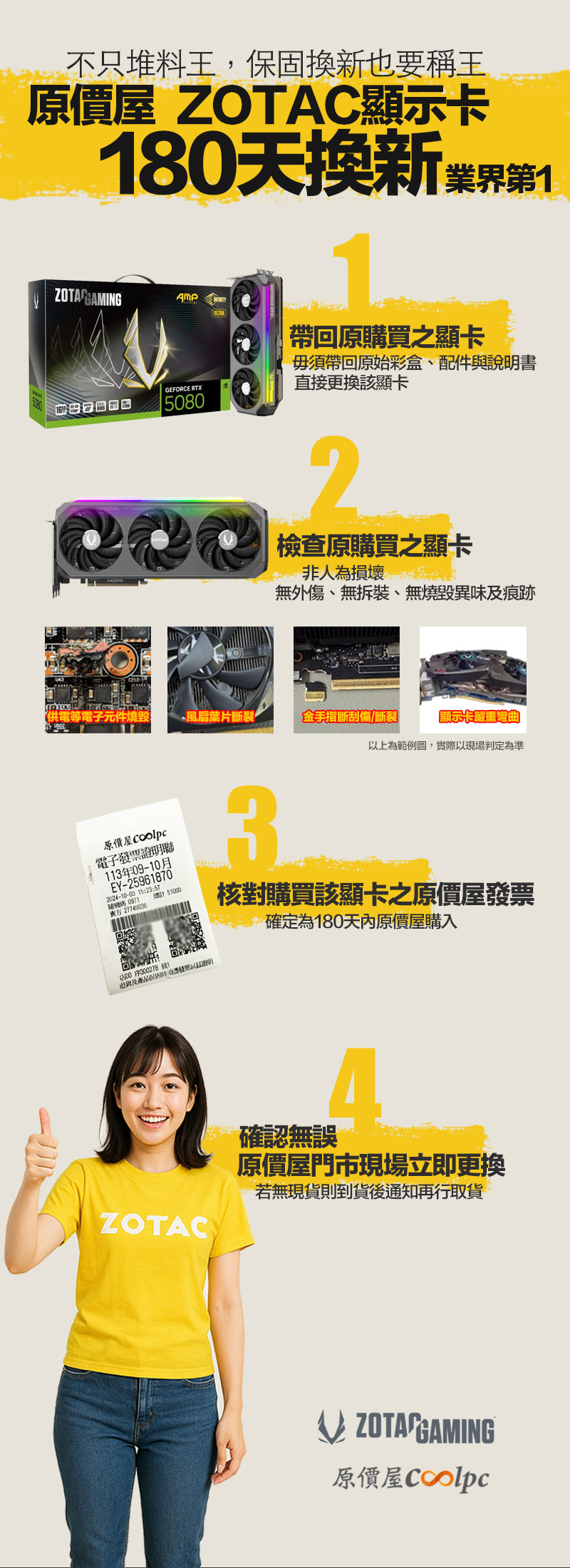 業界第一,在原價屋買ZOTAC索泰顯卡,享180天換新!了不起,負責!就算是RTX5090也照樣直接換新,這就是ZOTAC索泰堆料王不壞也不怕壞的絕對自信!其實本來在原價屋購買任何品牌商品就享有30天內換新(新品非人為故障)了,ZOTAC索泰硬是要拉長到180天,那可是整整半年呀!真是覇氣