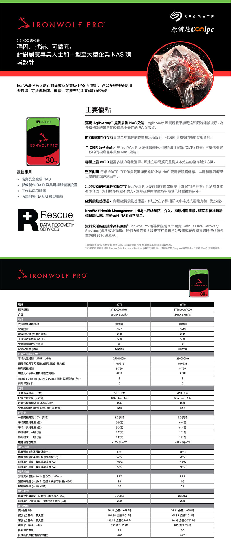 Seagate 28TB【那嘶狼 PRO】512M/7200轉/五年/3年 Rescue(ST28000NT000), $23350