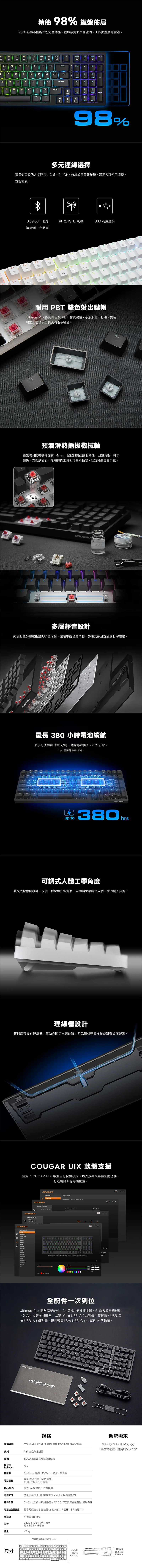 Cougar Ultimus Pro 三模鍵盤(白)/有線/無線/藍牙/98%布局/中文/紅軸/插拔軸, $1990