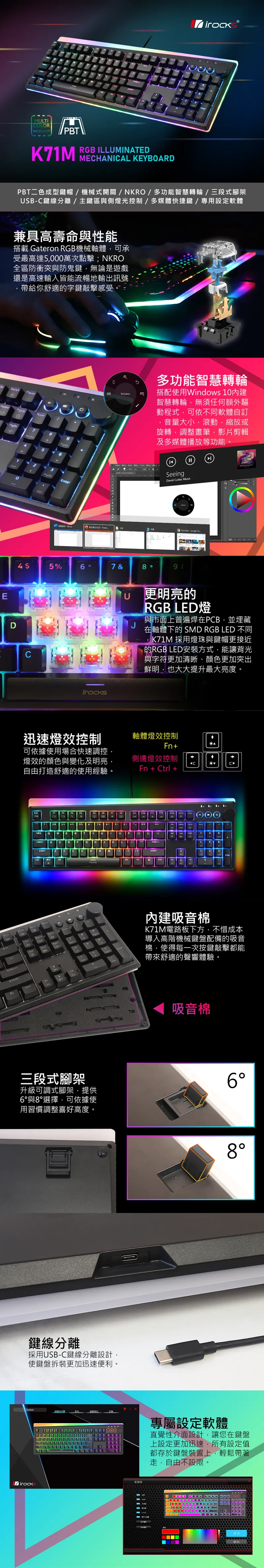 irocks K71M-Gateron 機械式鍵盤(黑)/有線/Pbt/紅軸/金屬旋鈕/中文/懸浮/Rgb, $2390↘$2190