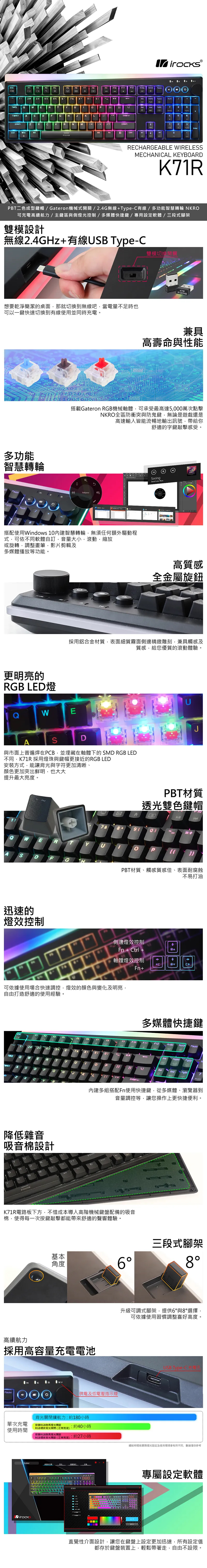 irocks K71R-Gateron 機械式鍵盤(黑)/無線/Pbt/青軸/金屬旋鈕/中文/專屬設定軟體/Rgb, $2890↘$2690