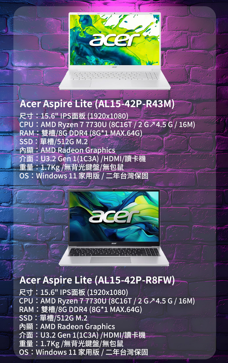 Acer Aspire Lite /R7-7730U/8G/512G/15.6吋/白 AL15-42P-R43M (蝦皮